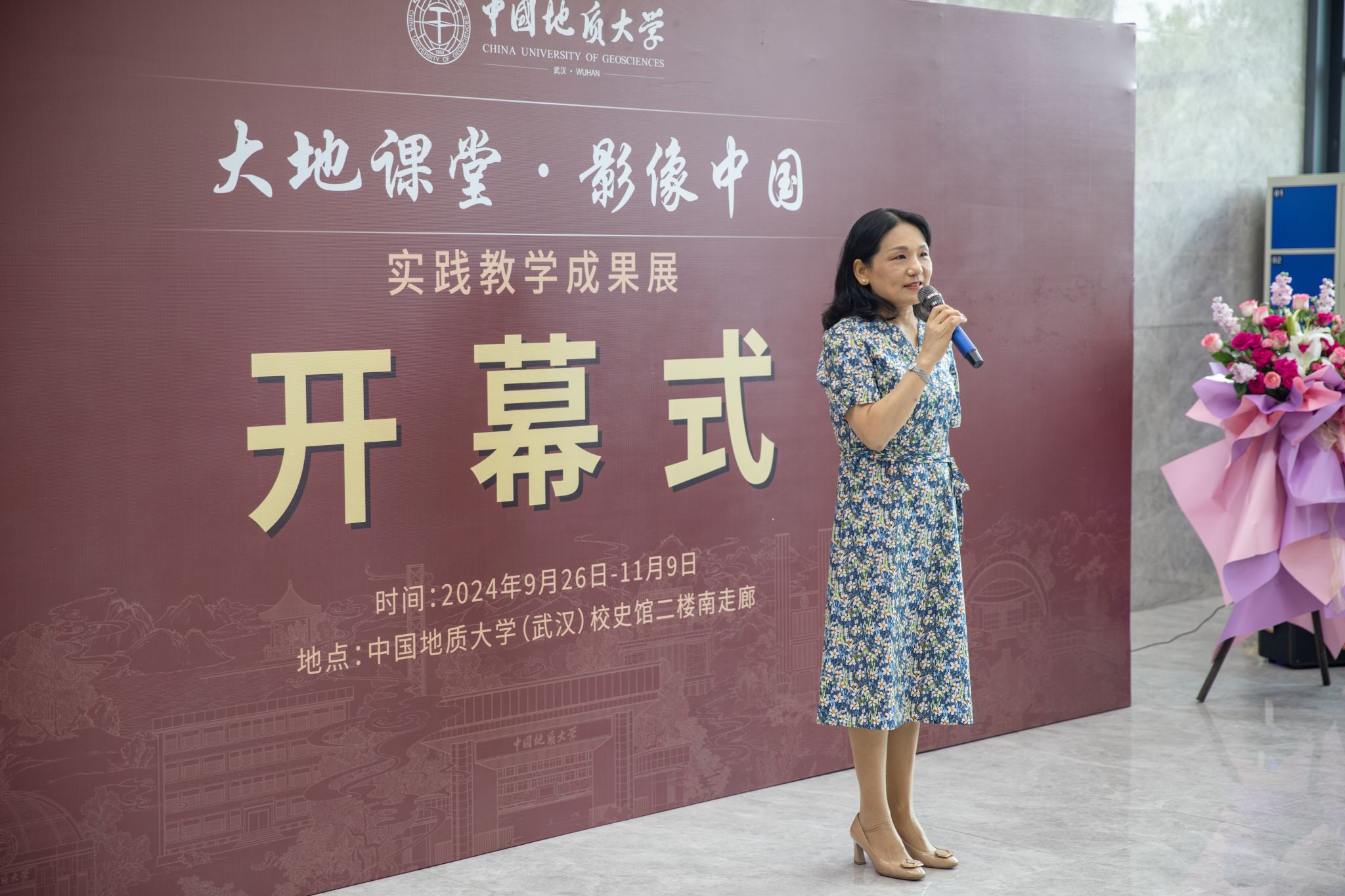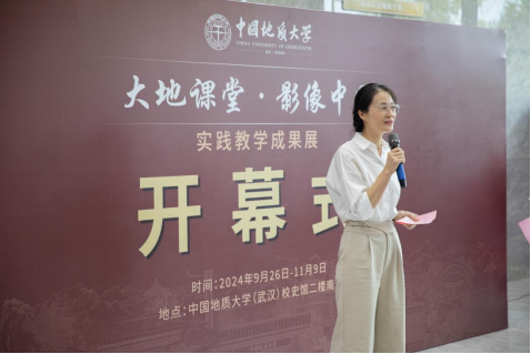 (武汉)“大地课堂 影像中国”实践教学成果展在校史馆正式开幕。党委宣传部部长侯志军,图书档案与文博部部长帅斌,本科生院副院长、党委学工部副部长蒋怀柳,安徽潜山天柱山研学旅行有限公司总经理马晓芬和安徽天柱山地质公园工程师刘彬,杏色
