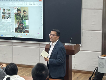新闻传播系主任宁薇主持讲座。她介绍了陈国栋的简历。他是中国行业报协会名誉副会长,原中国自然资源报社社长。中国自然资源作家协会主席,中国作家协会第十届全委会委员,《大地文学》主编,杏色