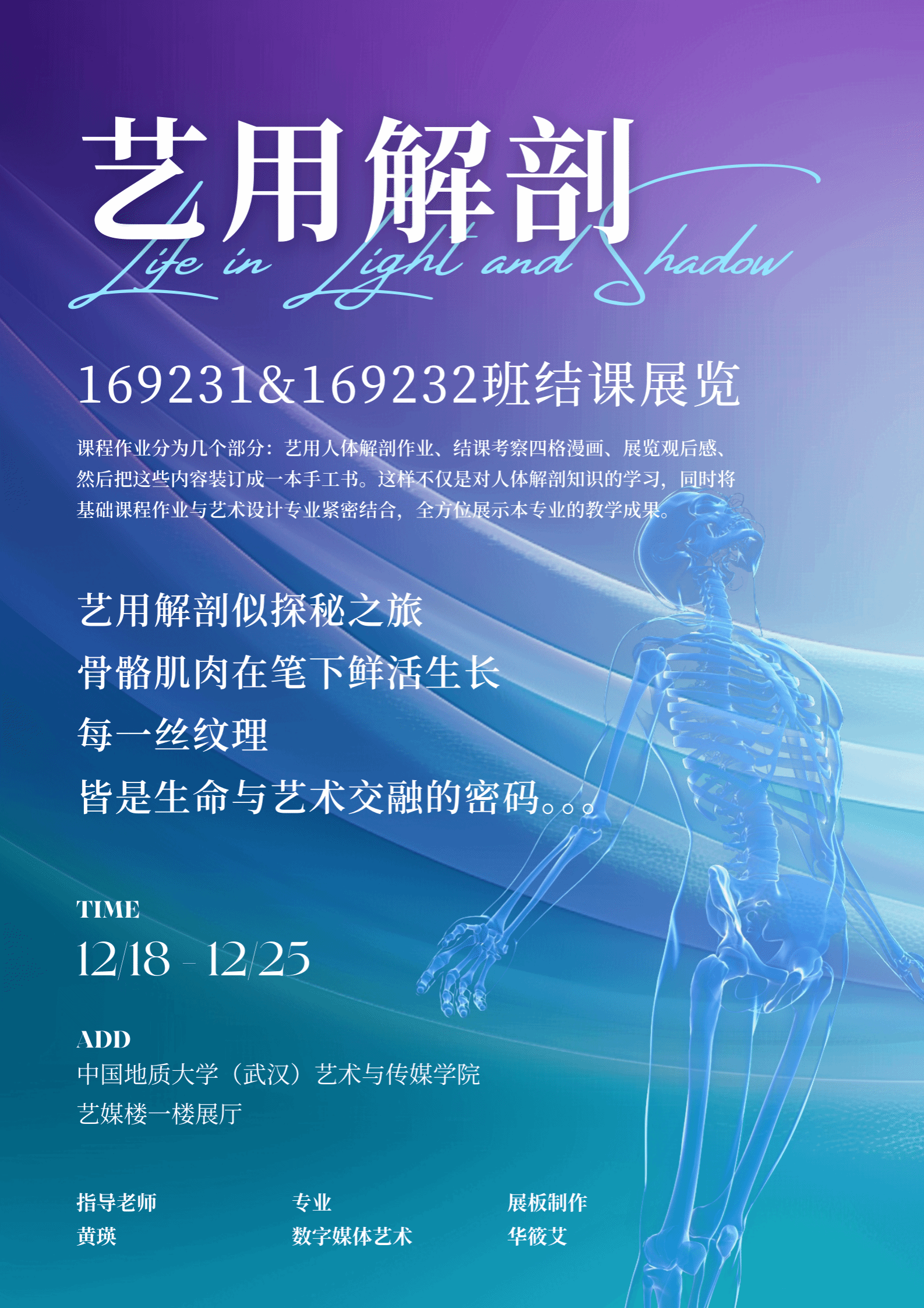 (通讯员:汤雨禾 周睿琪)2024年12月18日-2024年12月25日,在艺术与科学的交汇点上,艺术与传媒学院大楼一楼中厅,黄瑛老师指导数字媒体艺术专业169231&169232班的学生们以一场结课展览,展现了艺用解剖学的独特魅力。这场展览展示了学生们对人体解剖学的深刻理解,同时将艺术设计与课程作业紧密结合,以手工书的形式,多角度呈现了艺用解剖学的丰富内涵。