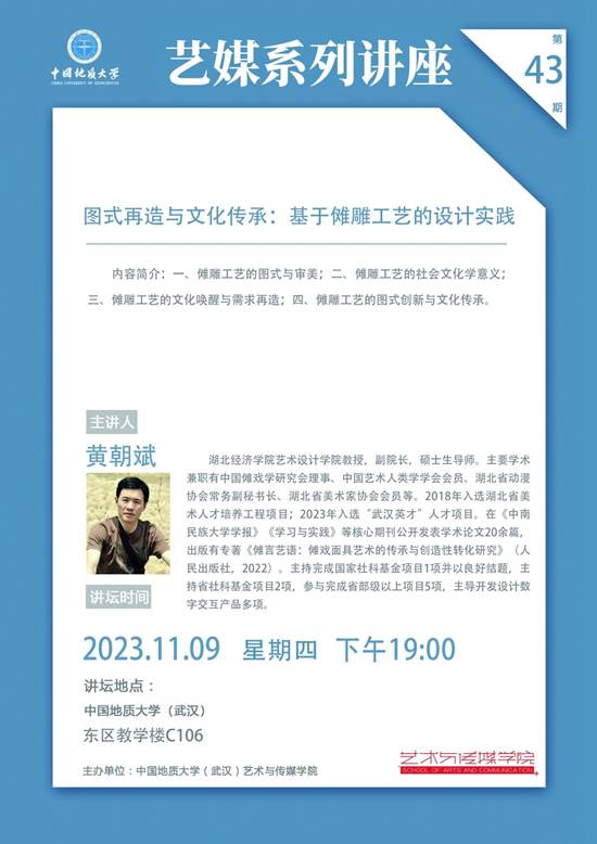 2023年11月9日下午19:00,以图式再造与文化传承:基于傩雕工艺的设计实践为主题的艺术与传媒系列讲座在东教C106顺利召开。此次讲座由艺术与传媒学院院长何清俊教授主持,湖北经济学院艺术设计学副院长黄朝斌教授主讲。