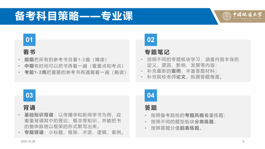 主讲人谌天一本科为广播电视学专业,考研初试专业课 256 分、排名第二,曾获 “优秀毕业生”、米兰设计师大赛湖北省三等奖等荣誉。作为跨专业考生,她分享了新闻传播学备考方法:专业理论可以分阶段进行学习,前期精读、中期抓重点、考前略读;可以按照 “定义 - 原因 - 影响 - 发展” 整理专题笔记,同时补充案例与院校论文;答题建议结合院校风格分类计时练习。公共课方面,英语除刷真题外,可以读一些外文杂志进行拓展;政治多刷肖八、肖四客观题,用背诵手册巩固知识点。