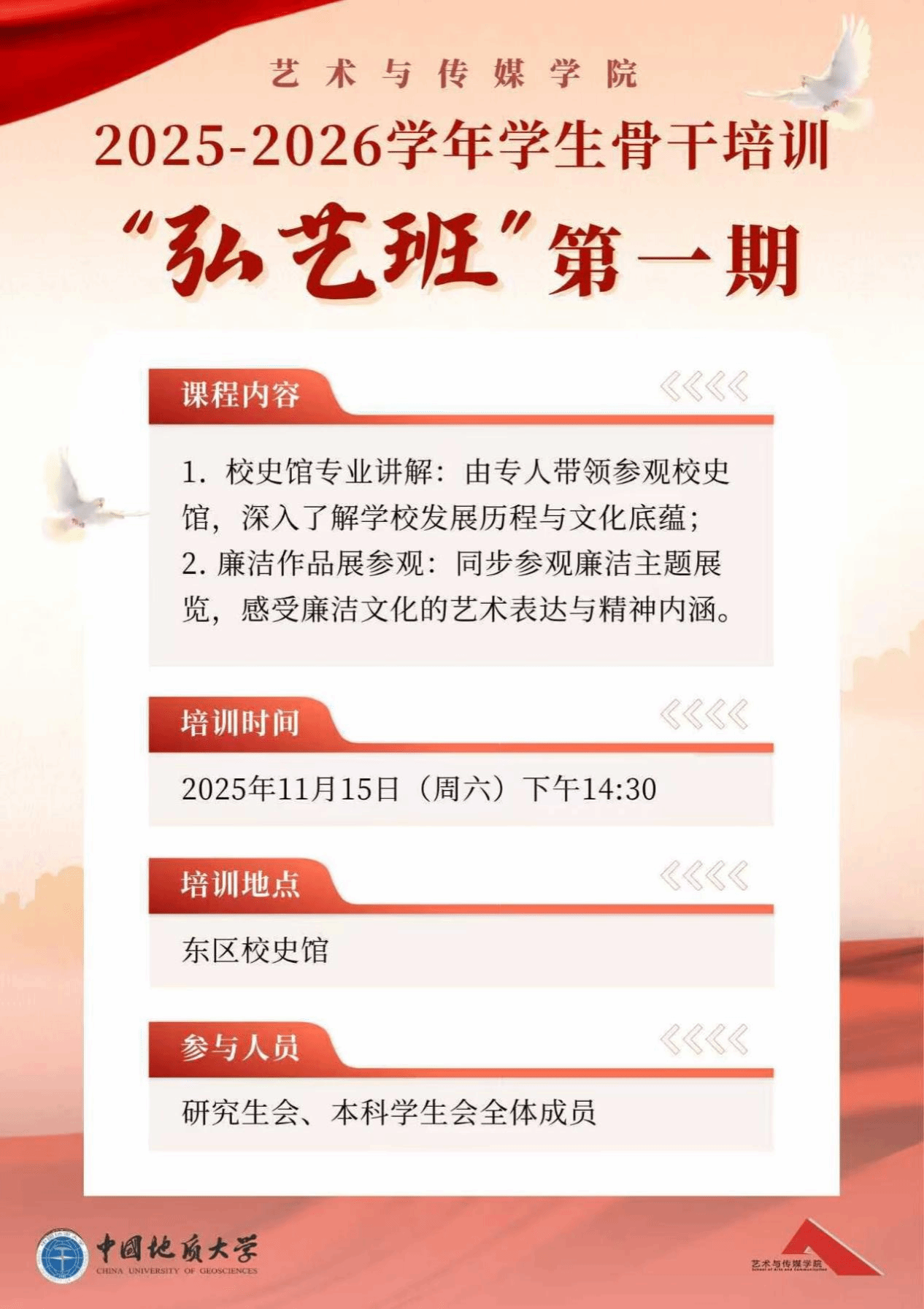 为了进一步加深学生骨干对学校优良传统和历史底蕴的深刻理解,同时丰富和拓展学院廉洁教育的多样形式,提升教育实效,11月15日,中国地质大学(武汉)艺术与传媒学院组织研究生会及学生会成员前往校史馆,开展了一场主题为“校史与廉洁文化”的作品展览参观学习活动。通过此次活动,旨在让同学们在直观感受学校辉煌历程的同时,深刻领悟廉洁文化的精神内涵,从而在思想上树立正确的价值观和行为准则。