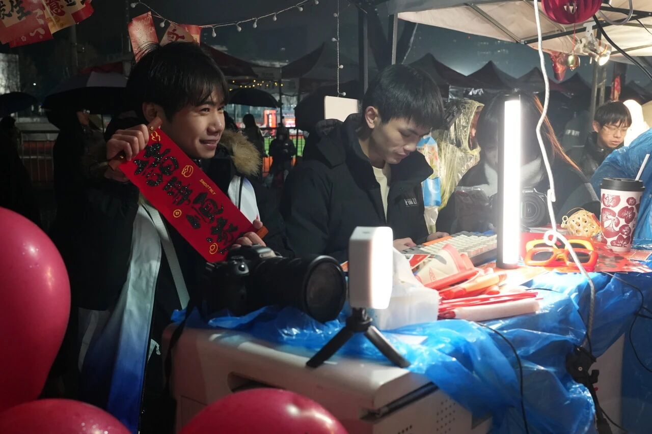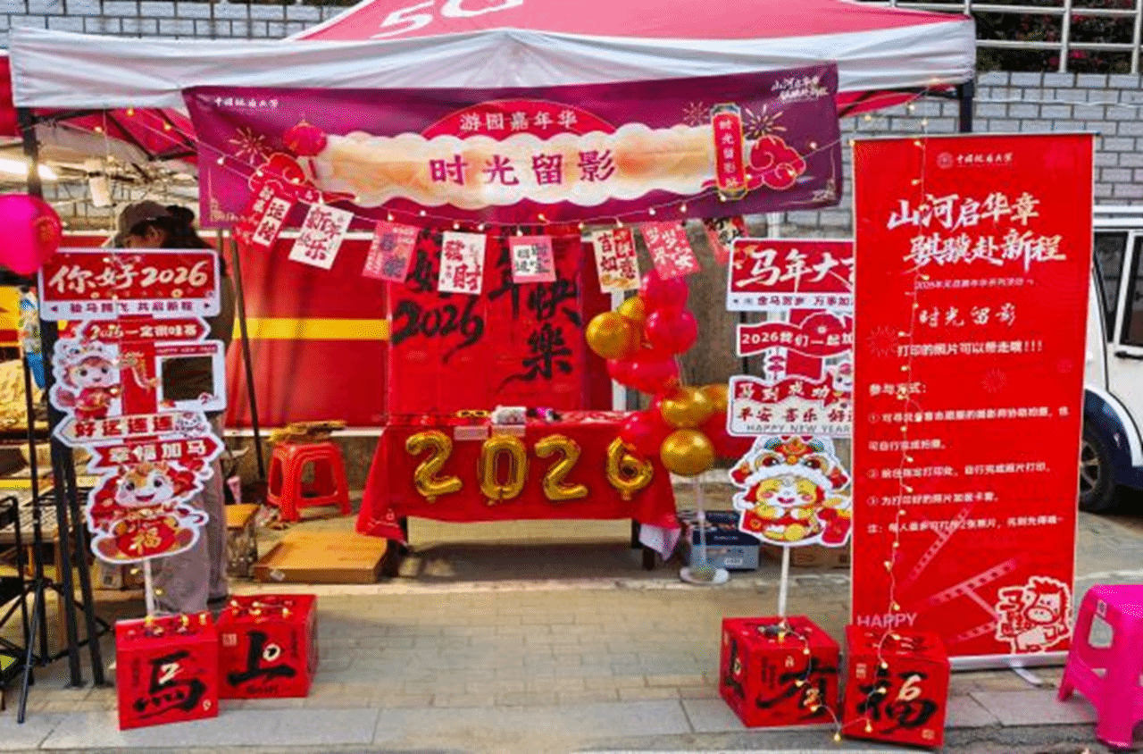 “艺绽新岁,媒启元章”“时光留影”等艺术与传媒学院负责的主题摊位筹备了各类跨年装饰道具,为师生提供合影留念与即时打印服务,覆膜封装的照片让师生们的跨年美好瞬间得以留存;游戏互动摊位设置了趣味项目,师生们积极参与、友好比拼,在活动中放松身心,成功闯关者获得定制礼品。