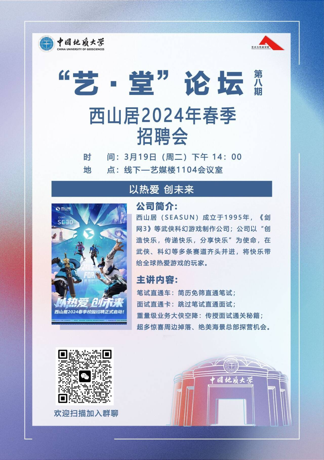 2024年3月19日下午14:00,“艺·堂”论坛第八期西山居2024年春季招聘会于艺媒楼1104顺利举行。西山居公司本次招聘负责人廖宇琪,以及音频中心本次招聘面试官、负责人何文雯为大家讲解招聘的具体需求。本次会议由兼职辅导员徐雯茜主持。