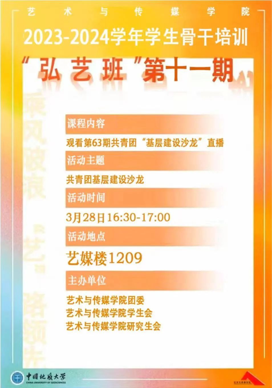 为深入贯彻落实习近平总书记关于共青团在学生思想政治工作中发挥主力军作用的重要要求,提高同学们的爱祖国意识,增强党性修养,3月28日,艺术与传媒学院学生骨干培训“弘艺班”第十期在1209会议室顺利进行,学生会、研究生会学生骨干在团委书记单湉艺老师的带领下集体学习观看第63期共青团“基层建设沙龙”直播与“学党史爱祖国教育”线上公益大讲堂。