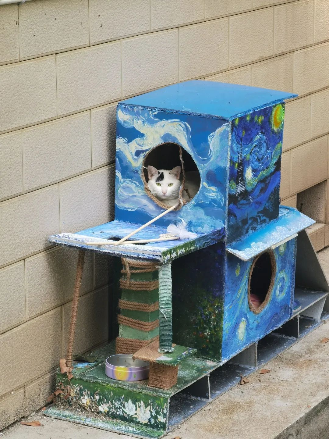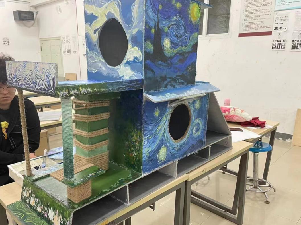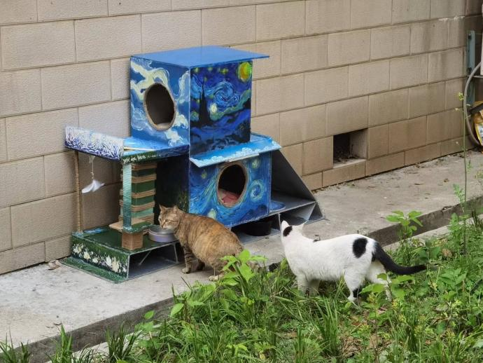 我们给这个猫舍取名为“喵星事务所”,设计理念是我们认为校园里的流浪猫都生活在遥远的喵星球,而我们设计的猫舍是人与猫交流互动的特定场所,猫猫可以在这里沉浸式与人互动,并且享受喵生。我们在猫舍的装饰上选择了梵高的《星月夜》,更加贴合我们的设计理念。