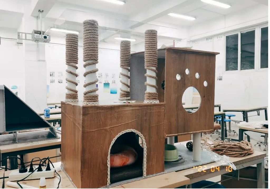 在整个建造猫舍的过程中,猫舍从无到有,从想法到图,再从图到落地开始搭建,到最后搭建完,老师的指引让我们很完整的参与上述的所有过程,让我们对建筑设计这门课有了初步的认识和入门。虽然中途会有波折和结果成品不是很完美,但面对亲手搭建的猫舍还是有些成就感的,更重要的是我们在小组在实践中学会了如何分工合作,学会了如何根据甲方(猫猫和人)更好的设计建造出猫舍......尤其是验收点评后,我们认识到自身实践成果的不足,懂得了以后如何更好的去建造更合适更完美的作品。