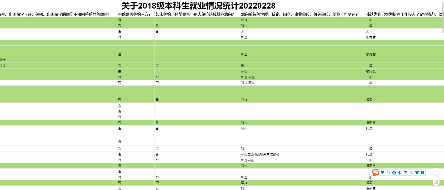 另外,设计、发放毕业年级就业问卷,作为摸查工作的重要信息来源。就业问卷从就业意向、签订情况、用人单位的属性、实习信息、就业信心评估、就业压力评估几方面设计,不仅希望调查学生的就业“硬信息”,也希望及时发现、总结学生就业过程中的困难与心理矛盾等“软信息”。
