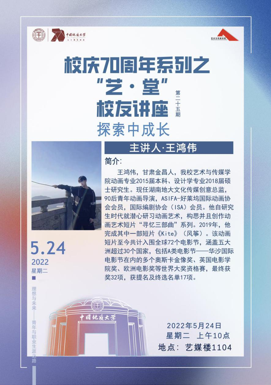 校友王鸿伟以自己的成长经历为主线展开了本次分享。童年时期的他生性活泼,是当地能说会道的“预言家”。但五岁之后由于环境的改变,他开始变得沉默寡言,这也恰巧让他与画画结缘,逐渐埋头于绘画创作,潜心于自己的小世界,也开始思考自己的人生。在经历青春期的叛逆之后,王鸿伟来到了地大,开始了人生的新篇章。研究生期间,他在动画领域不断学习和探索,毕业之后也毅然坚持完成自己的作品。谈及19年三月份某一个失眠的晚上,他非常激动,因为那是一个灵感涌现的夜晚,他连夜创作出记忆中那个小男孩的故事,即后来斩获多个电影节奖项的动画短片《Kite》(风筝)的雏形。谈及创作,他表示其中的过程无疑是漫长而孤独的,但也正因如此我们反而需要静下心来花时间去调整、去沉淀。回首过往,他将自己的经历总结为——“探索、成长”,他认为人生的道路应该由自己来把握,要学会享受别样的人生,经历独一无二的探索和成长的过程,然后淬炼成金、涅槃重生。