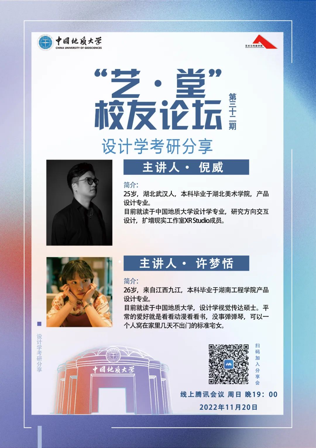 于线上举办了第三十二期“艺·堂”校友论坛——“设计学考研分享”讲座。本次分享会邀请了2022级设计学研究生班的倪威、许梦恬两位同学作为主讲人分享、交流考研经验,大三、大四部分学生线上参会。