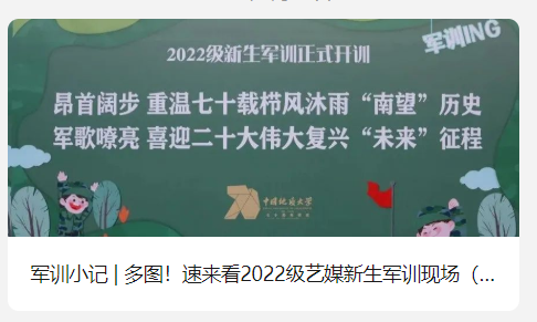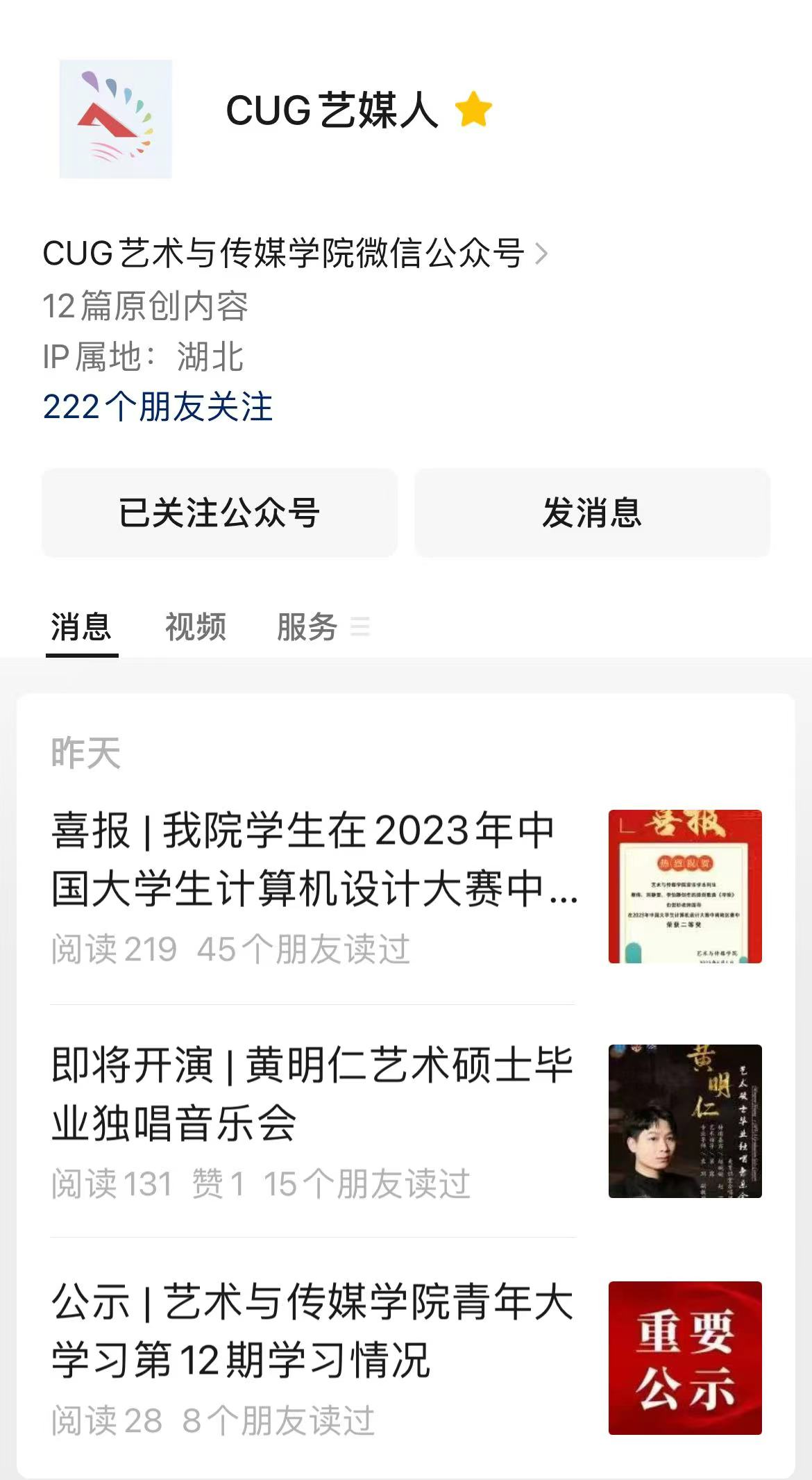 微信公众号“CUG艺媒人”致力于丰富同学们的课余生活,做好各项通知、要闻的二传手,帮助同学们了解学院最新动向以及和自身发展、生活有关的各项事宜。因2021年疫情影响,杏色