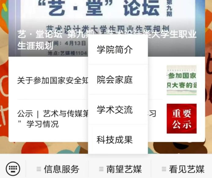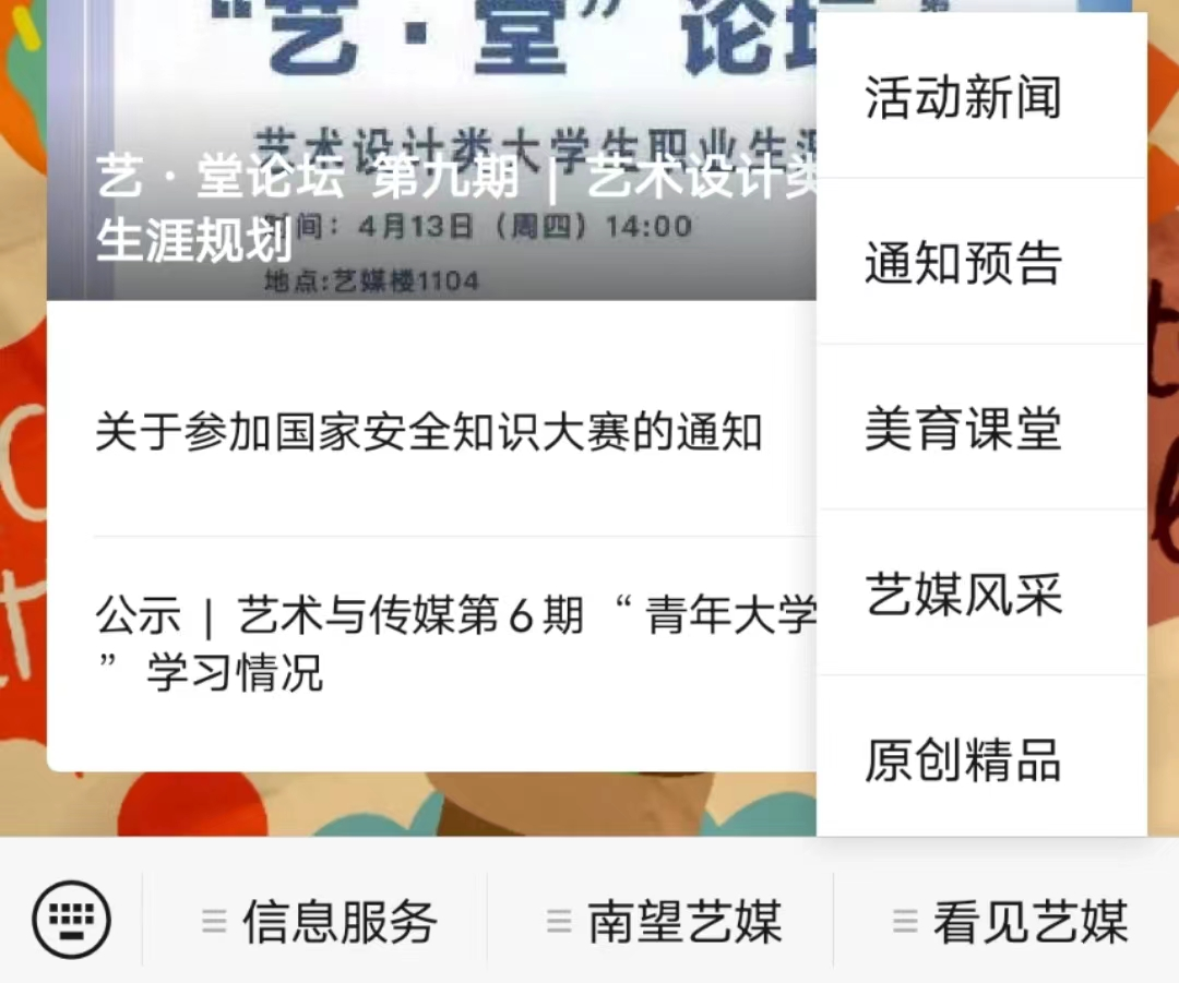 微信公众号“CUG艺媒人”菜单栏经重新设计改版后,现设有3大栏目,分别是信息服务(迎新地图、就业信息)、南望艺媒(杏色简介