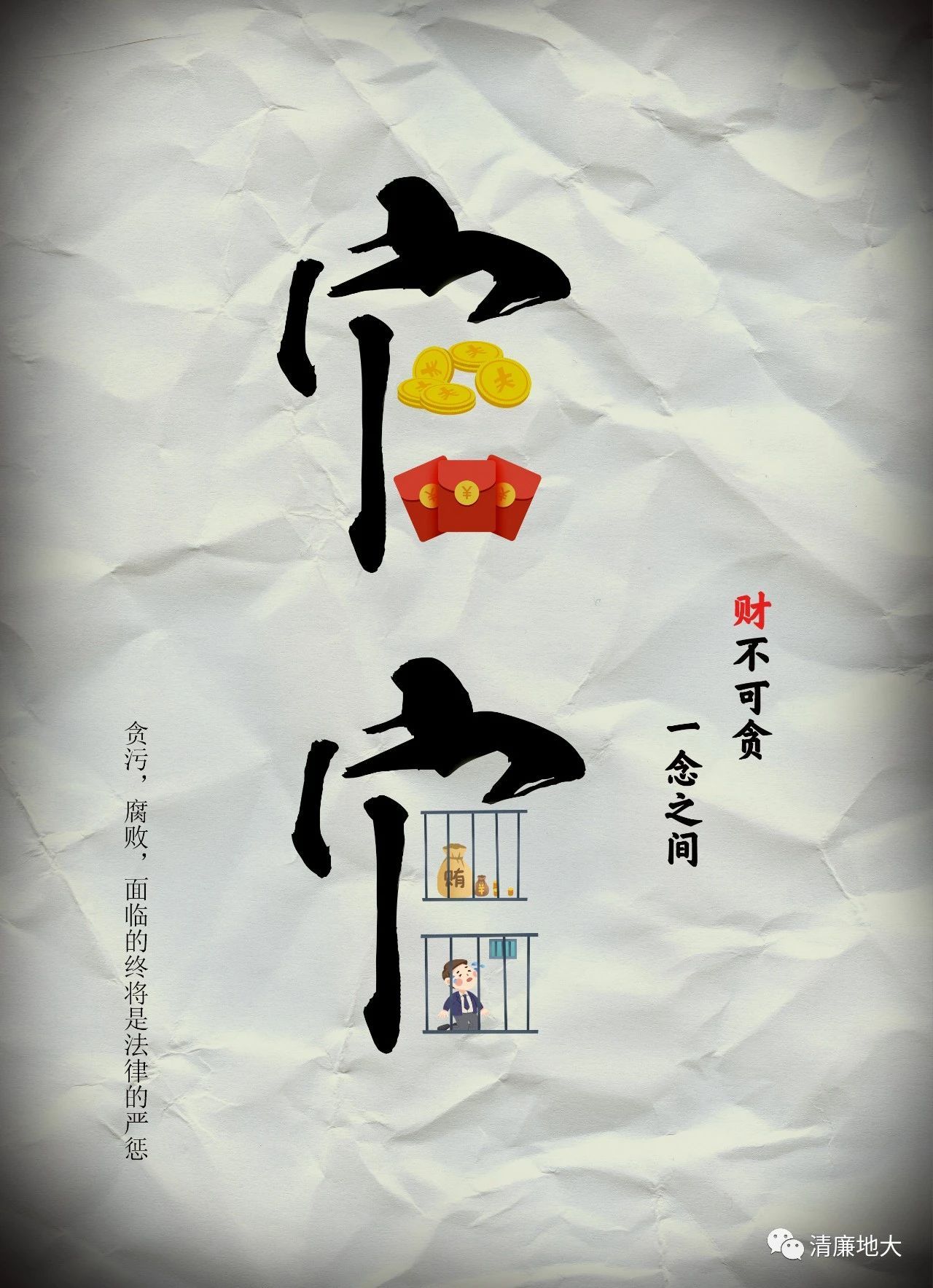 海报的主体由两个官字组成,上面的那个官字的两个口巧妙的用钱币和红包组成,而下面的的官字两个口则是用监狱的牢笼组成,寓意在官场上会有很多的金钱诱惑,但是很多钱都是不正当的,为了金钱稍有一念之差,就会把自己关到牢笼里,丢掉了本该有的职务还要受到法律的制裁。