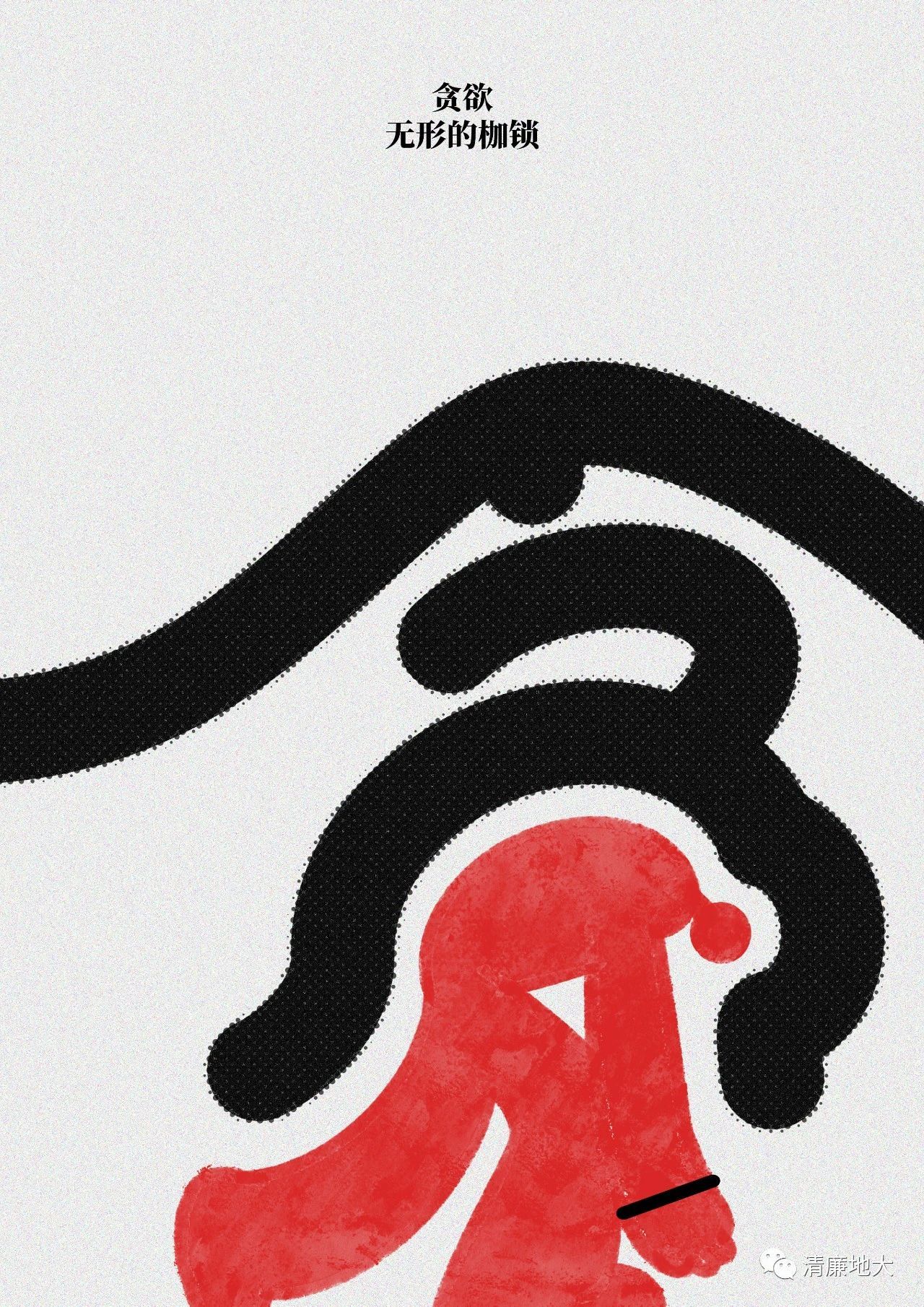 本作品利用“贪”字进行再设计,通过将“贪”字底部的“人”替换成负重前行的人的形象,以突出“贪”如同大山,使人压抑。