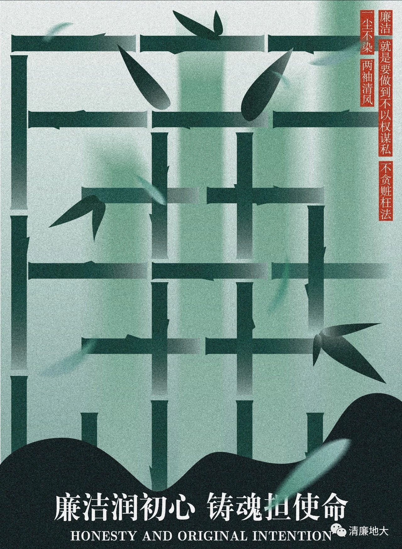 本作品以“竹节”替换笔划,拼成廉字,以此将竹与廉进行了结合,紧扣主题。构图上采用居中对齐的方式,将主体“廉”字放大占满版面,突出主题,同时在版面下方将山石进行了扁平化的处理,一在体现竹自山石而生却依旧挺拔的坚韧之性,二在用山石作为中国地质大学的表象。最后在画面右上角仿古题字,写上温家宝总理曾在全国机关事务工作协会第四次全员代表大会上所说的话:“廉洁,就是要做到不以权谋私,不贪赃枉法。一尘不染,两袖清风。”以此在形式上突出古韵,在内容上加强主题。