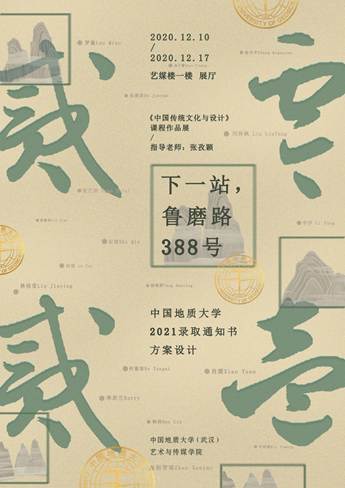 2020年12月10日,艺术与传媒学院展厅举办了《下一站,鲁磨路388号——中国地质大学2021录取通知书方案设计》展。本展览是视觉传达专业方向《中国传统文化与设计》课程作品展,同时也是设计专业大类平台课程成果展示。