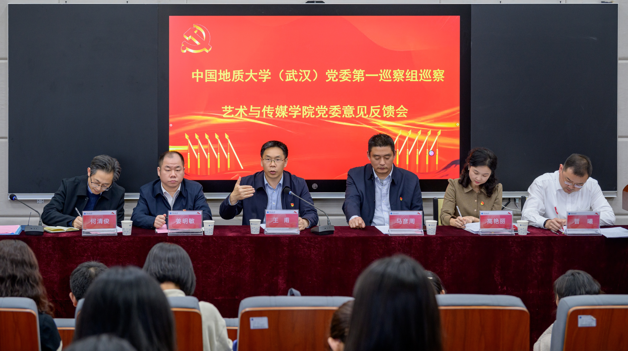 校党委常委、副书记王甫同志,巡察组组长地球物理与空间信息学院党委书记马彦周同志,副组长环境学院党委书记姜明敏同志和工程学院党委副书记高晓东同志,巡察办副主任高艳丽同志,巡察组成员丁为同志、刘琴同志、李向南同志、王碧同志、刘筱同志、闫维蓉同志,杏色 党委领导班子全体成员出席现场反馈会议,学院全体教职工、民主党派人士和学生代表等列席会议。