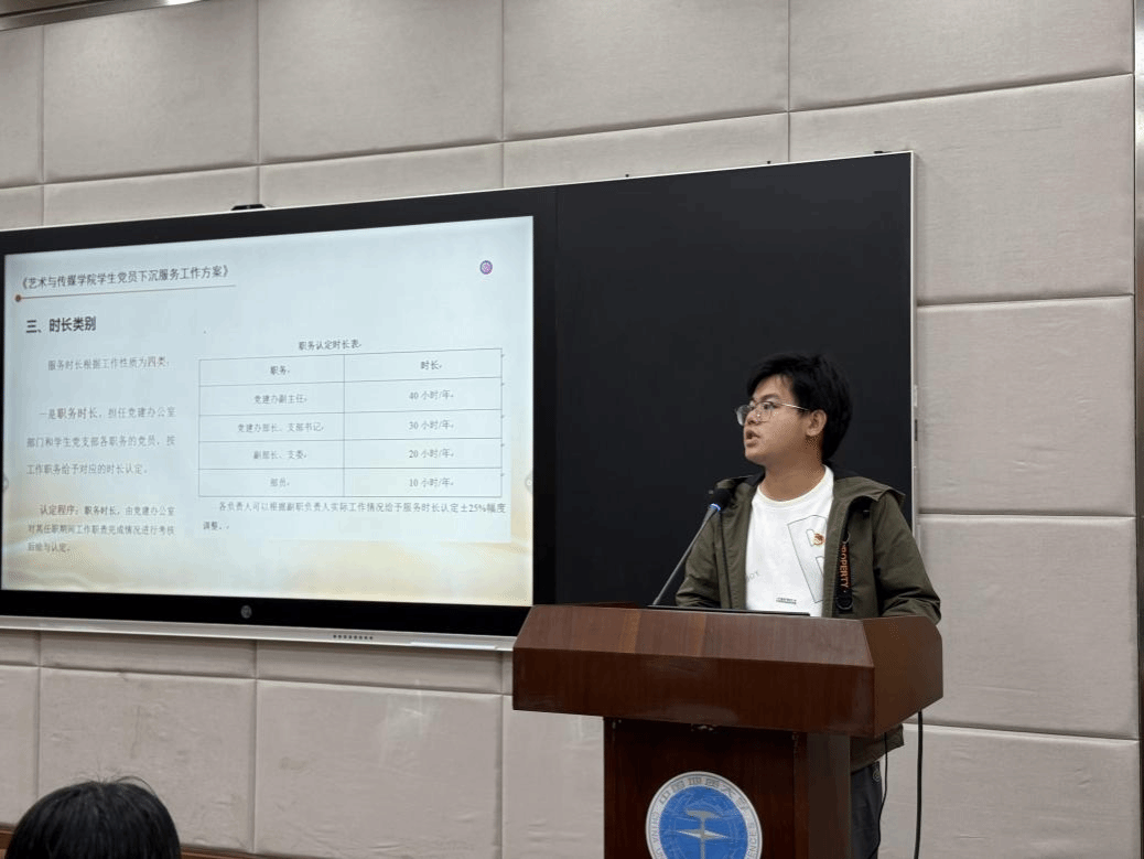 专职辅导员姜盛为同志领学《艺术与传媒学院学生党员下沉服务工作方案》。该方案的核心是以“服务时长”量化考核学生党员,根据工作性质将服务时长分为职务时长、岗位时长、参与时长、志愿服务时长四类,引导学生党员极主动参与校内外各类实践服务,由党建办公室统一认定汇总,并将结果与党员评议挂钩,推动其在服务中当先锋、作表率。