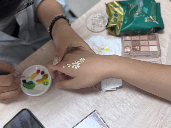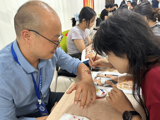 在国庆与中秋双节来临之际,为传承中华传统文化、营造温馨浓厚的节日氛围,9月 29 日上午,由后勤保障部学生住宿服务中心、本科生院主办,艺术与传媒学院觅灮美育名师工作室、“艺” 心为你心理驿站承办的“月满中秋迎国庆,我和祖国共成长”主题面部彩绘活动在西区63栋一站式服务大厅104会议室顺利举行。觅灮美育名师工作室成员周若君、仝宇、高玮泽、闫莹颖、张笑钏、邵梦华,学工组辅导员曾戈晖,兼职辅导员曹彬彬现场参与,与学校师生共同沉浸于色彩与心灵的创意对话。